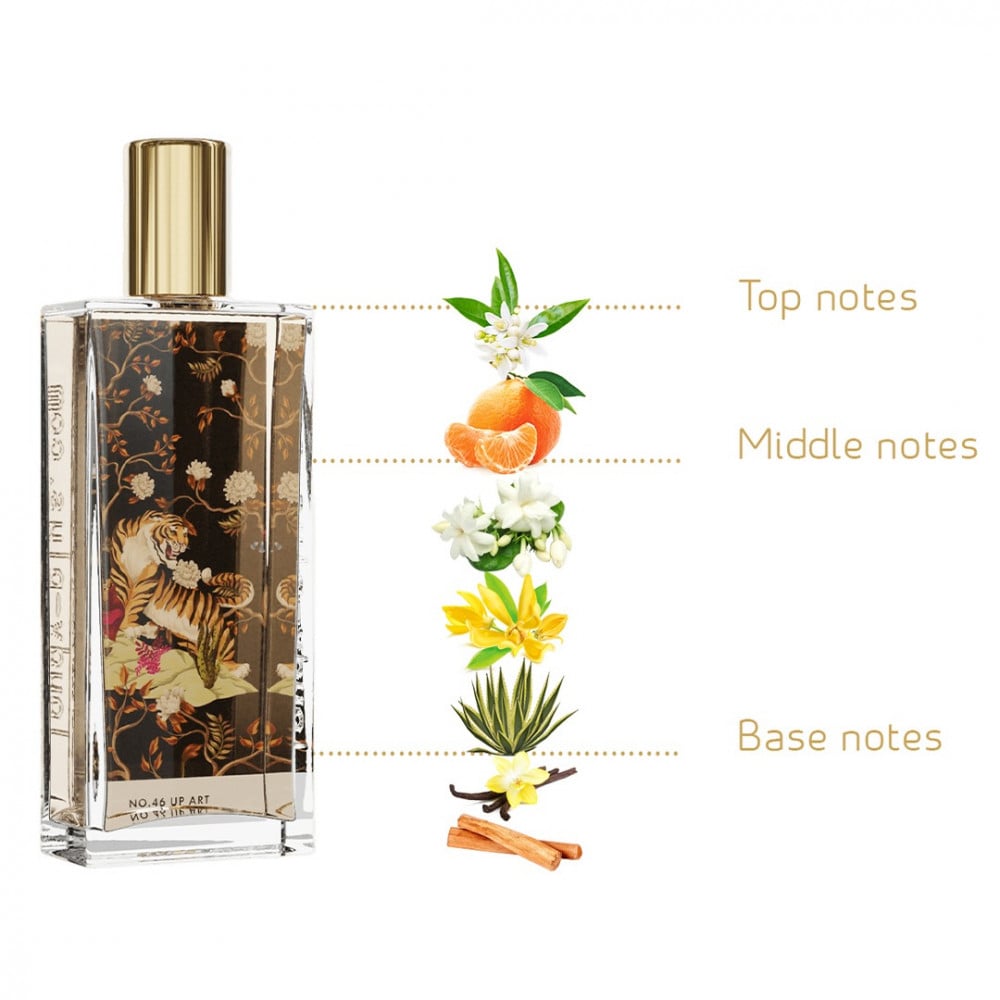The scent of UP ART NO.46 perfume is attractive and makes you feel happy and refreshed. With the first spray of the perfume, the scent of the opening ingredients begins to appear, which is a bright, refreshing scent of the most beautiful citrus scents. After a few moments, the scent of the aromatic heart begins to appear, which is a distinctively earthy, rose scent that helps you feel romantic and calm. Then a warm and delicious scent of musk and vanilla emanates.